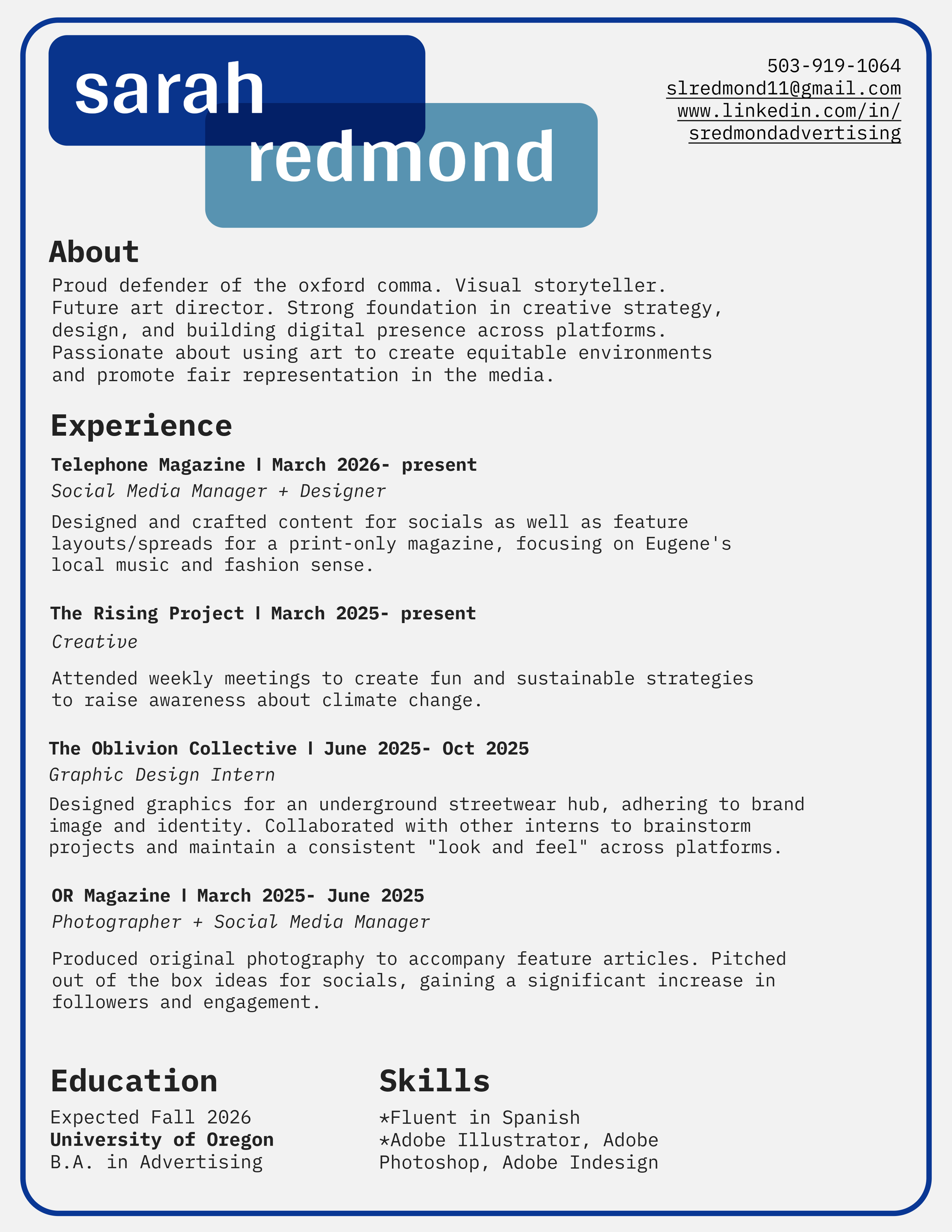 I’m a proud defender of the oxford comma, a visual curator, and a future art director. When I'm not in Allen Hall diving into the vast world of creativity, you'll probably find me chasing a sunset or capturing life through my lens. Currently studying advertising with a minor in Spanish at the University of Oregon, I'm building my foundation in art direction and all things creative.